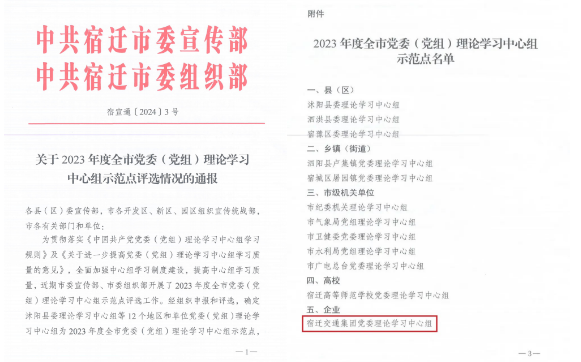 日前,市委宣傳部、市委組織部印發(fā)《關(guān)于2023年度全市黨委(黨組)理論學(xué)習(xí)中心組示范點(diǎn)評選情況的通報(bào)》,宿遷交通集團(tuán)黨委理論學(xué)習(xí)中心組獲評2023年度全市黨委(黨組)理論學(xué)習(xí)中心組示范點(diǎn)。這也是全市唯一一家企業(yè)獲此殊榮。