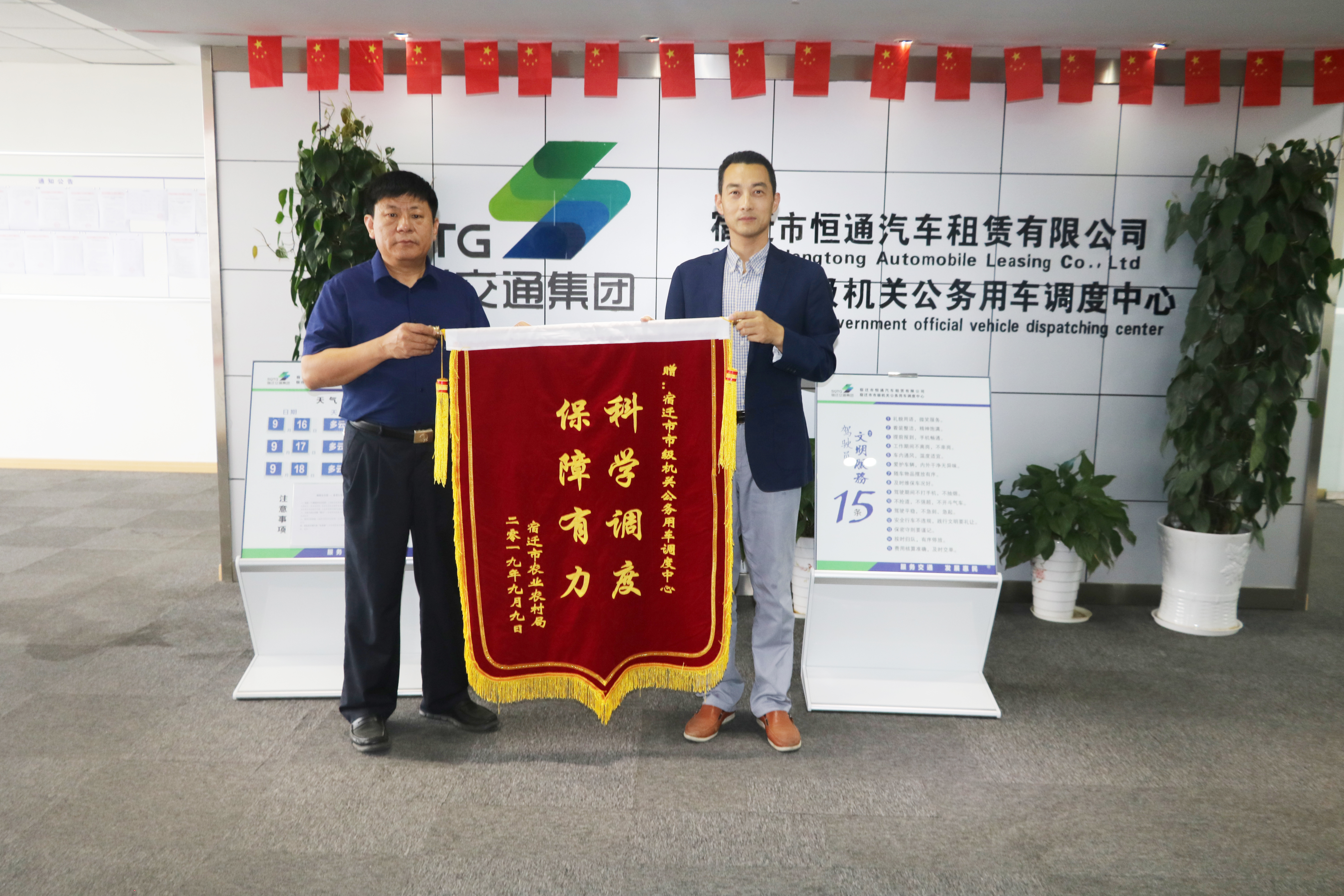9月19日,宿遷市農(nóng)業(yè)農(nóng)村局將一面書有“保障有力 科學調(diào)度”的錦旗送至公車調(diào)度中心,對公車調(diào)度中心工作人員長期以來提供高標準、高質(zhì)量的服務表示衷心感謝。同時對中心涌現(xiàn)的一批優(yōu)秀職工代表提出表揚,對他們出色的工作表現(xiàn)給予肯定。