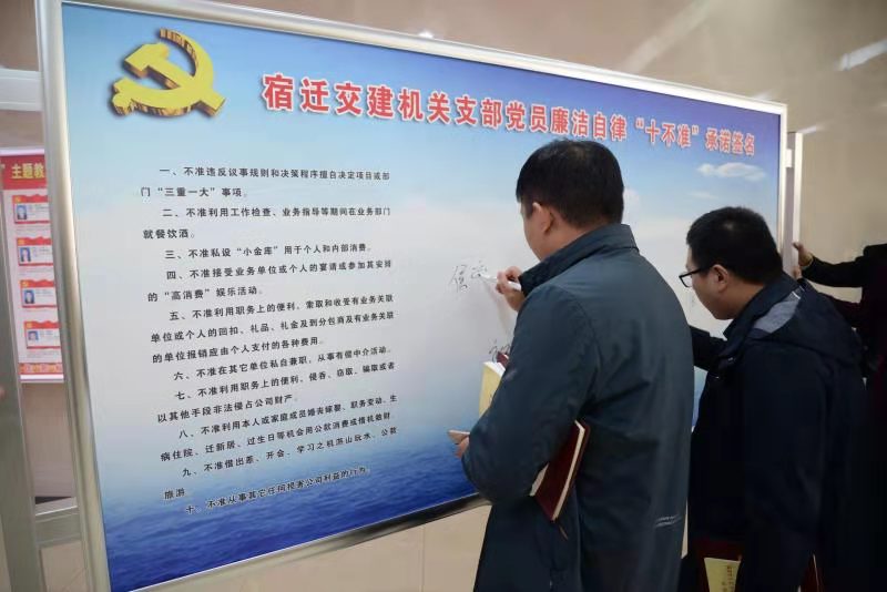 隨后,全體與會(huì)人員簽訂《宿遷交建廉潔自律十不準(zhǔn)》承諾書(shū)。簽訂儀式上,支部書(shū)記要求大家充分發(fā)揮表率作用,對(duì)照承諾書(shū)進(jìn)行經(jīng)常性自我檢查,將自己置于組織和職工的監(jiān)督之下,自我警示、自我約束。