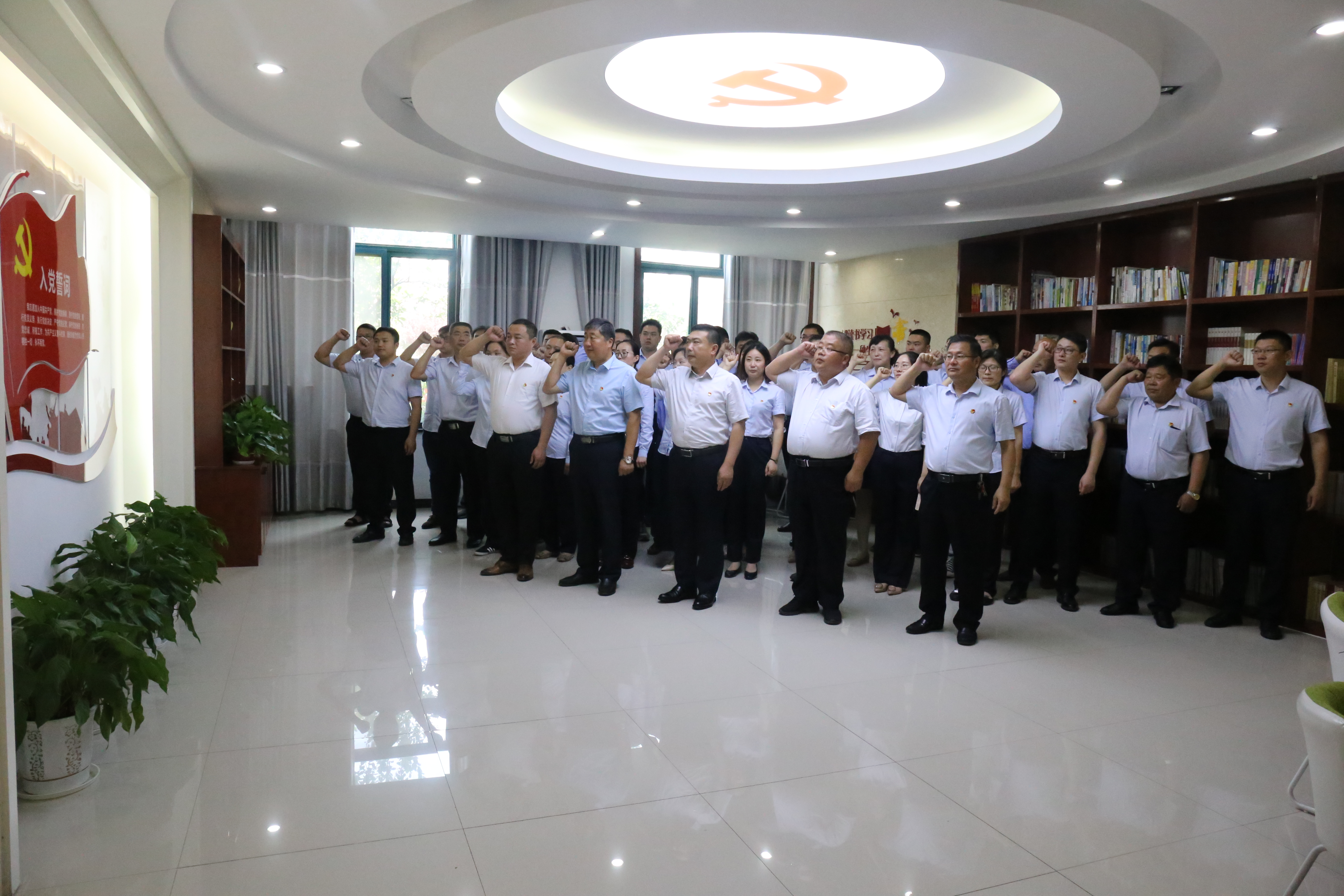 在職工書屋內,公交公司黨總支書記朱宗明帶領50余名黨員在黨旗下莊嚴宣誓。激昂的宣誓聲,讓全體黨員接受了一次精神上的教育和洗禮,更加堅定了理想信念。