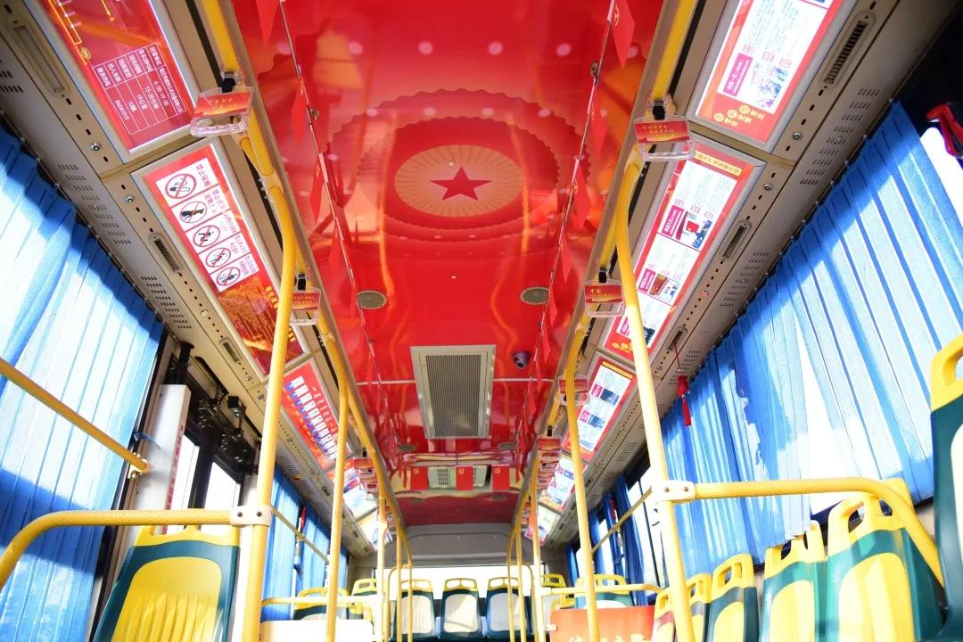 這條紅色主題車廂文化的打造格外引人注目,整車以鮮艷的中國(guó)紅打底,以公交車廂為載體,以紅色基調(diào)布置的車廂讓乘客感受到濃濃的國(guó)慶氛圍,身處其中仿佛置身于歷史時(shí)空的長(zhǎng)廊,享受著視覺上的一場(chǎng)盛宴。