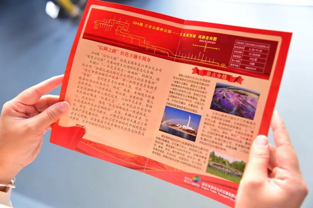 304線路起訖宿遷·義烏國(guó)際商貿(mào)城——三臺(tái)山國(guó)家森林公園站,串連雪楓公園、宿遷市國(guó)防園會(huì)議中心、三臺(tái)山國(guó)家森林公園等多個(gè)黨性教育景點(diǎn)。公交公司以線路為依托,細(xì)心的印制了“信仰之路宣傳冊(cè)”,里面包括了景點(diǎn)介紹、主題車簡(jiǎn)介等內(nèi)容。乘客乘車時(shí)不僅能欣賞沿途風(fēng)光,更能隨手拿起宣傳冊(cè),邊看邊讀,一站式游覽宿遷紅色旅游文化,領(lǐng)略城市歷史底蘊(yùn)和文明宿遷風(fēng)土人情,彰顯了“人文公交”的服務(wù)內(nèi)涵。