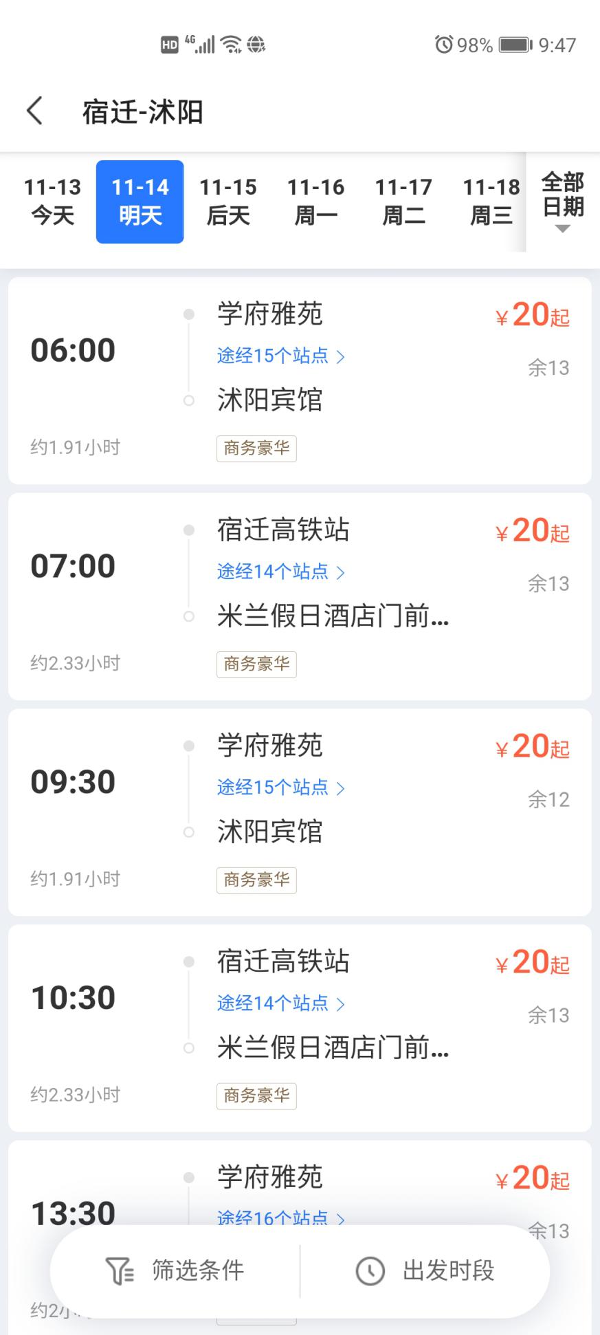 步驟二:選擇出發(fā)到達城市,例如:“宿遷-沭陽”;