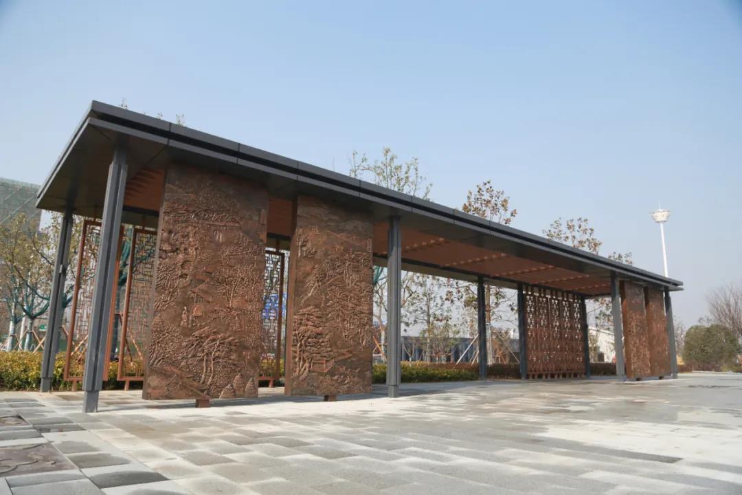 玖酒飄香浮雕的東西兩側(cè),分別設(shè)計(jì)了長(zhǎng)29米、高3.9米的文化長(zhǎng)廊,其上各鑲嵌了四幅宿遷歷史人文美景雕板,由國家一級(jí)美術(shù)師、宿遷市政協(xié)副主席、民盟市委主委丁立江先生牽頭,會(huì)同江蘇省作家協(xié)會(huì)理事、宿遷市作家協(xié)會(huì)主席韓玉喜,中國書法家協(xié)會(huì)會(huì)員、江蘇省書法家協(xié)會(huì)理事、宿遷市書法家協(xié)會(huì)主席張守躍,中國美術(shù)家協(xié)會(huì)會(huì)員郭鑫共同完成,每幅圖樣的創(chuàng)作都一一對(duì)應(yīng)前人留下的詩句。相傳“宿遷八景”出現(xiàn)于唐代,首載明萬歷《宿遷縣志》,以后續(xù)修,皆有記載。“宿遷八景”即為:“宿預(yù)早春、白鹿?jié)O歌、倉基蓮唱、草埝耕云、龍泉夜雨、馬陵秋月、梅村煮雪、司吾清曉”共八處風(fēng)光。“八景”各具特色,景象殊奇,歷代以來,項(xiàng)屬之地文人雅士相聚于“八景”之地,曲水流觴,迎風(fēng)弄月,留下了眾多文化典故。