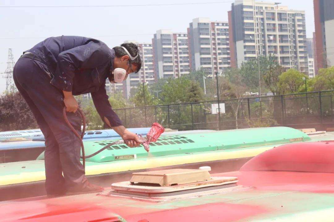 5月30日是星期日,上午10時,太陽炙烤著大地。在公交公司修理廠院內(nèi)的空地上,七八輛公交車露天停放。在公交車頂部,油漆工戴著防毒面具,穿著“五彩斑斕”的工作服,在熟練地進(jìn)行噴漆作業(yè)。