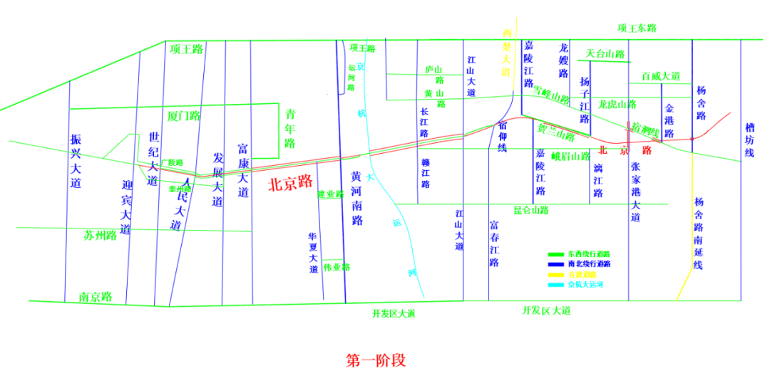 第一階段 (2021年7月16日至2022年8月20日) 封閉北京路(迎賓大道至人民大道)段,東西方向車輛由南側(cè)泰州路與北側(cè)廣陵路單向行駛,經(jīng)發(fā)展大道南北側(cè)輔道行駛至富康大道,富康大道至黃河南路正常行駛。原三號橋南半幅保持雙車道通行,運河?xùn)|至江山大道正常行駛,江山大道—西楚大道北半幅保持雙向兩車道通行。