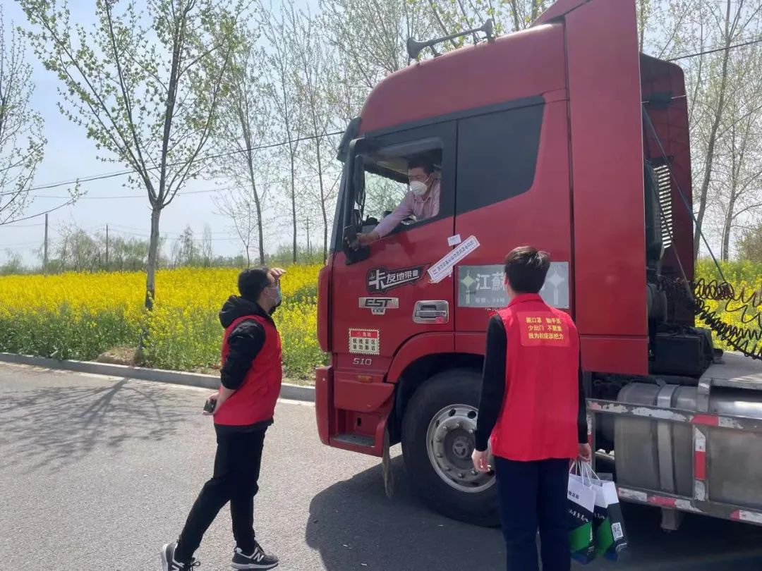 “我們是通湖物流園的志愿者,這次過來主要是想問一下你們滯留在這邊的情況,想征集一下你們的需求,解決一些實(shí)際問題。”4月9日,志愿者們帶著口罩、消毒液、泡面和礦泉水等物資暖心包來到園區(qū)附近區(qū)域,給貨車司機(jī)送上“安全保障”,并主動(dòng)征詢他們目前存在困難。“我們園區(qū)的東南角設(shè)置了核酸檢測(cè)點(diǎn),園區(qū)也設(shè)有餐飲(外帶)、超市、藥店、愛心驛站等,如果你們有需求可以到我們園區(qū)。”“你們可以聯(lián)系工商貿(mào)企業(yè)為你們開具車輛通行證了,持有通行證可以上高速,不用再滯留在這了。”“駕駛員司機(jī)是一個(gè)非常重要的群體,在疫情期間你們也做了巨大的貢獻(xiàn),我們也給你們點(diǎn)贊。”