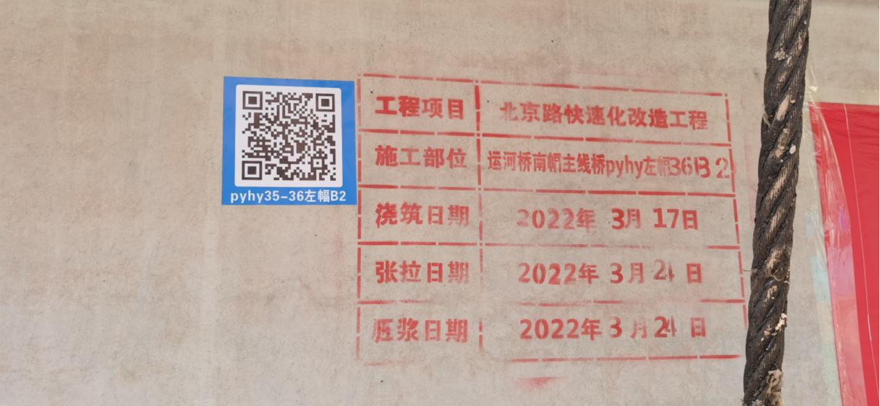 據悉,北京路運河橋河東南幅引橋為七聯簡支小箱梁,共11跨,每跨9片梁共99片。此次首片架設箱梁為28.9米小箱梁,最大自重約101噸,采用200噸架橋機安裝。在首片預制梁上,有噴印的編號等信息,還貼有專屬的二維碼,只需用手機掃碼,即可顯示出制梁位置、澆筑日期、設計方量等信息,就像每個人的身份證信息一樣,這樣不僅有助于快速準確地定位,也有助于后期需要時進行追溯查詢。