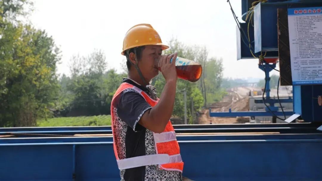 在268省道宿遷段工程(洋河新區(qū)段)和346省道宿豫段改擴(kuò)建工程施工現(xiàn)場,建設(shè)者們熱情高漲地進(jìn)行橋梁架設(shè),一名工人休息時刻喝著公司準(zhǔn)備給他們的綠豆茶。