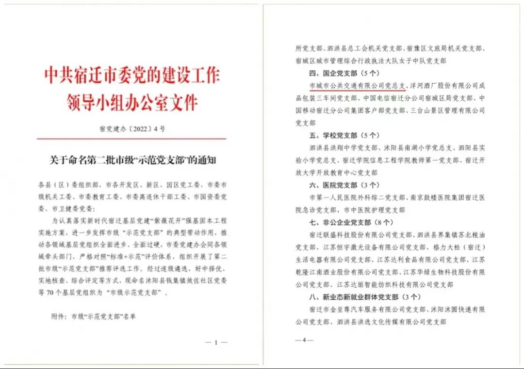 近日,中共宿遷市委黨的建設(shè)工作領(lǐng)導(dǎo)小組辦公室下發(fā)《關(guān)于命名第二批市級“示范黨支部”的通知》,公交公司黨總支榮獲市級“示范黨支部”稱號。