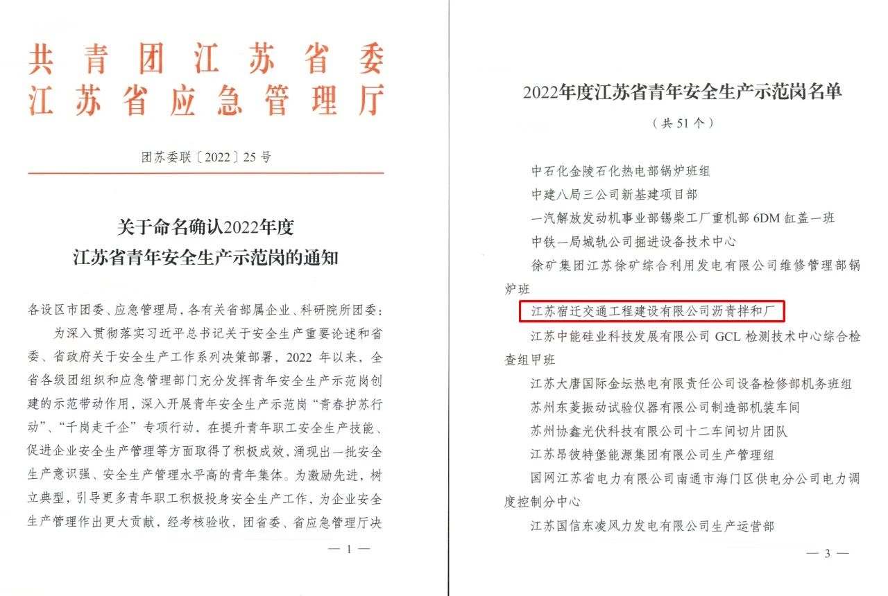 近日,共青團(tuán)江蘇省委和江蘇省應(yīng)急管理廳聯(lián)合發(fā)文,公布“2022年度江蘇省青年安全生產(chǎn)示范崗”名單,宿遷交建瀝青拌和廠成功入選。