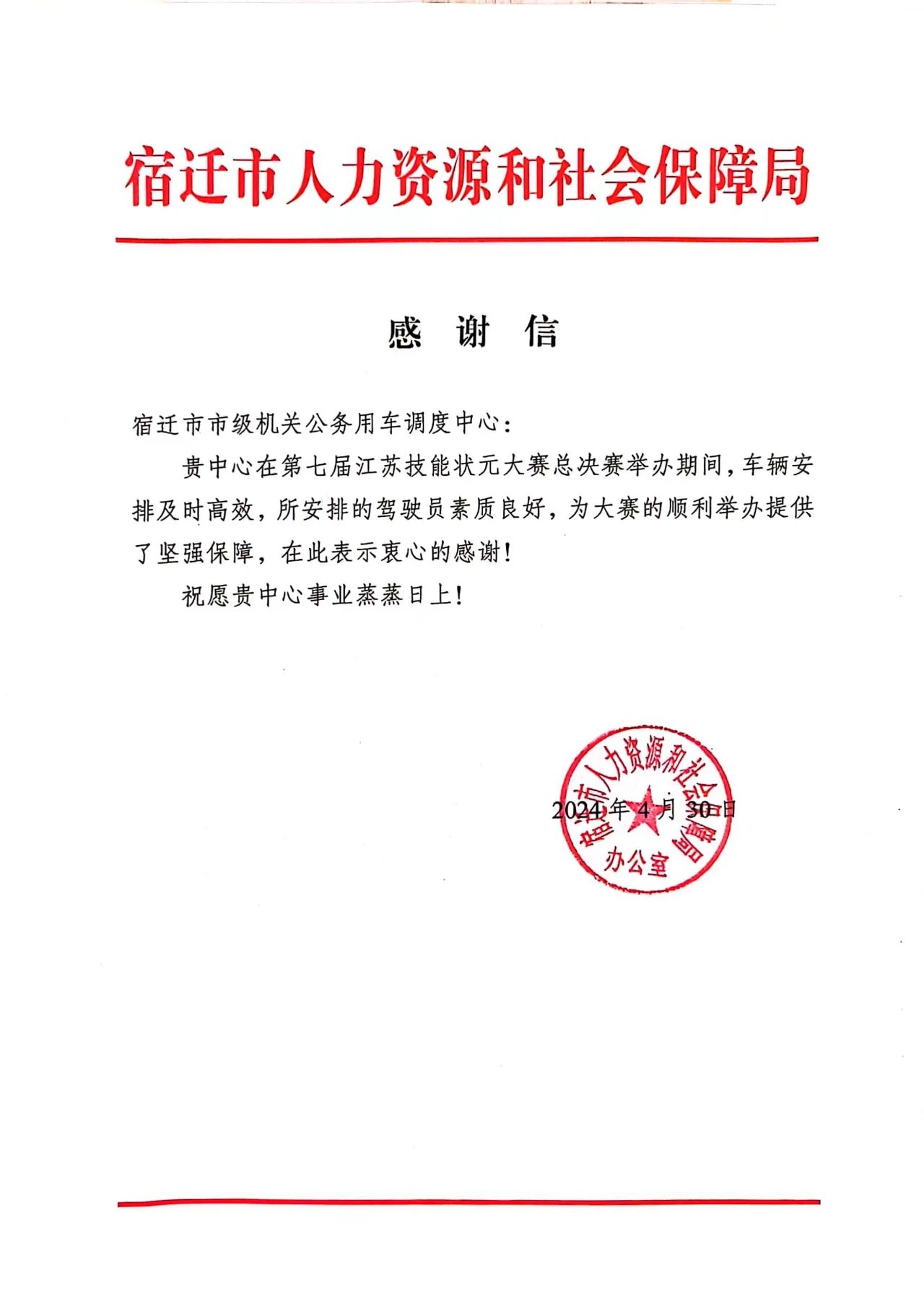 4月30日,宿遷市人力資源和社會保障局將一封感謝信送至恒通租賃(公車調(diào)度中心),對恒通租賃(公車調(diào)度中心)在本次活動保障過程中安全、高效的服務品質(zhì)和專業(yè)、用心的工作態(tài)度表示感謝。