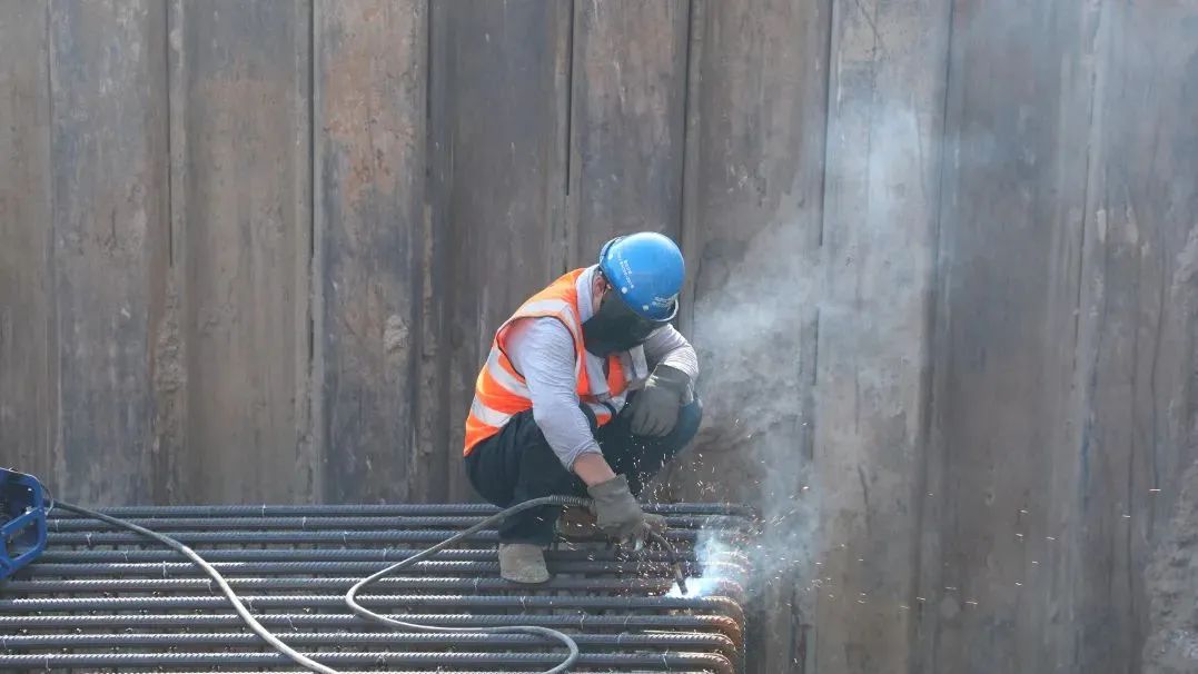 在宿遷大道項(xiàng)目現(xiàn)場(chǎng),電焊工穿著長(zhǎng)袖工作服、戴著勞保手套,只見他一手拿著焊槍,一手拿著防護(hù)面罩,正進(jìn)行承臺(tái)鋼筋焊接,電焊產(chǎn)生的火花飛揚(yáng)濺射。