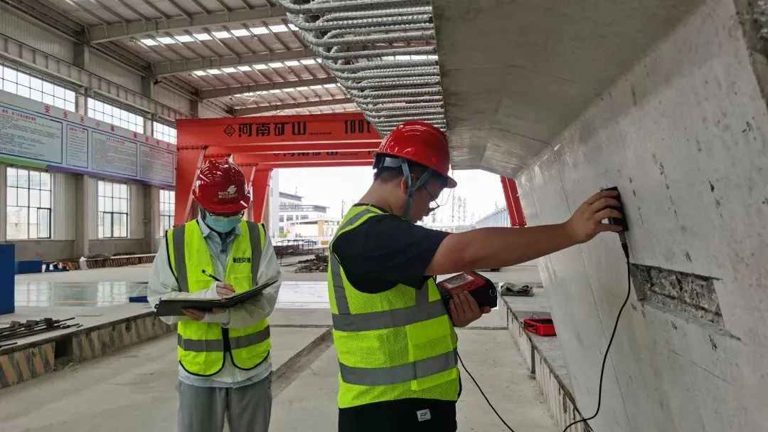 在通泰綠色建材生產(chǎn)基地箱梁預(yù)制加工區(qū)內(nèi),為了加強(qiáng)混凝土結(jié)構(gòu)的質(zhì)量驗(yàn)收,工作人員正在對(duì)預(yù)制箱梁進(jìn)行鋼筋保護(hù)層厚度檢測(cè)和記錄。