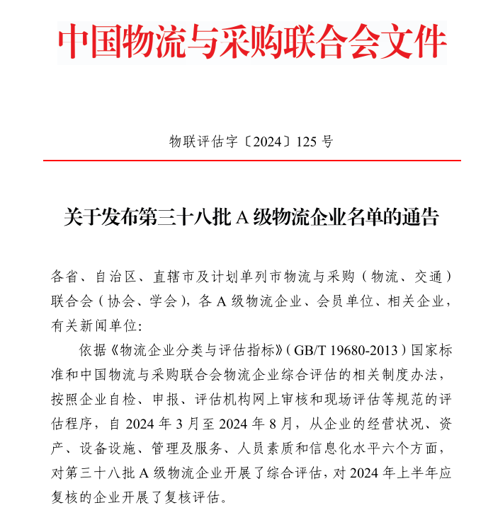 近日,中國(guó)物流與采購聯(lián)合會(huì)發(fā)布了全國(guó)第三十八批A級(jí)物流企業(yè)名單,通湖物流園憑借優(yōu)異的綜合實(shí)力和服務(wù)水平,成功在兩年的時(shí)間里從全國(guó)3A級(jí)物流企業(yè)躋身全國(guó)4A級(jí)物流企業(yè)的行列,也是該批次宿遷市唯一一家獲得該項(xiàng)資質(zhì)認(rèn)定的物流企業(yè)。
