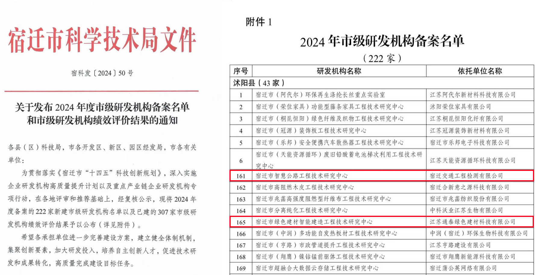 近日,宿遷市科學(xué)技術(shù)局發(fā)布通知,其中,宿遷交建所屬企業(yè)宿遷交通工程檢測(cè)有限公司申報(bào)的“宿遷市智慧公路工程技術(shù)研究中心”、江蘇通泰綠色建材科技有限公司申報(bào)的“宿遷市綠色建材智能建造工程技術(shù)研究中心”被認(rèn)定為市級(jí)研發(fā)機(jī)構(gòu)。