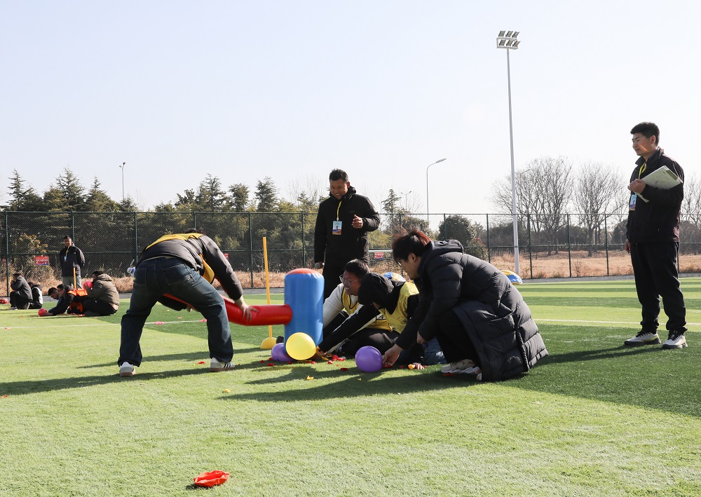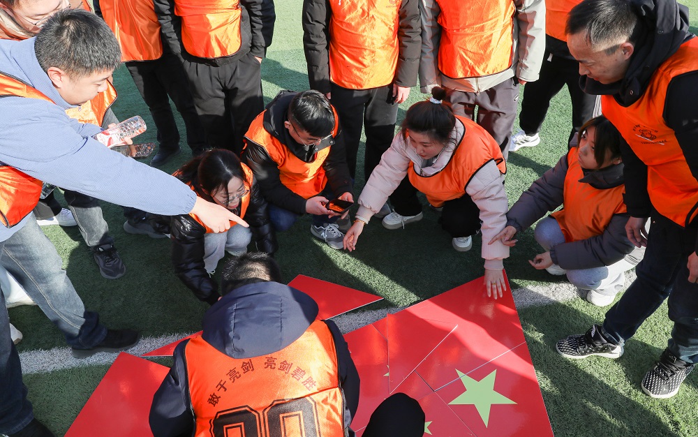 “運(yùn)轉(zhuǎn)乾坤”作為開場(chǎng)項(xiàng)目便點(diǎn)燃了現(xiàn)場(chǎng)氣氛。參賽隊(duì)員們步調(diào)一致、齊心協(xié)力,歡笑聲和加油聲此起彼伏。緊接著,“齊頭并進(jìn)”和“袋鼠運(yùn)瓜”等趣味游戲讓大家在歡快的互動(dòng)中增進(jìn)彼此間的默契。“國旗拼圖”項(xiàng)目則考驗(yàn)了團(tuán)隊(duì)的智慧與協(xié)作能力,眾多隊(duì)伍在激烈的競(jìng)爭(zhēng)中展現(xiàn)了巧妙的分工和默契的配合。