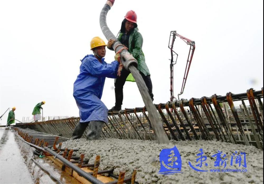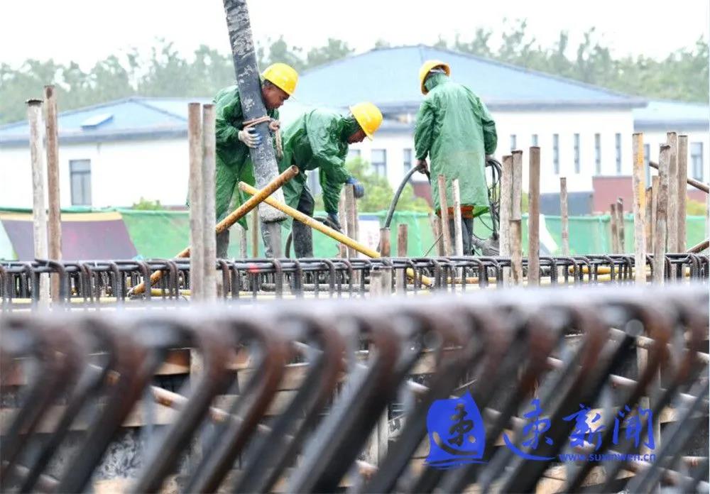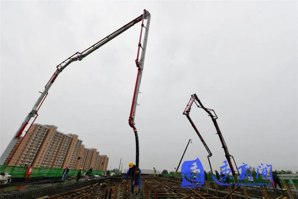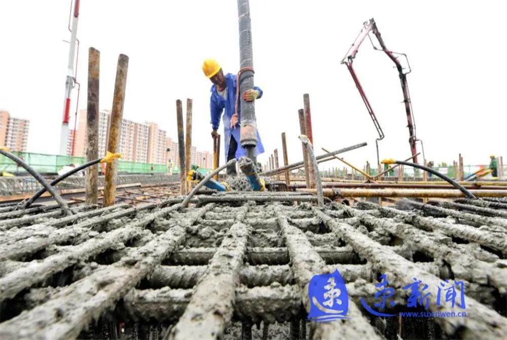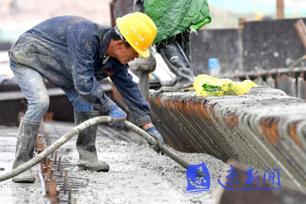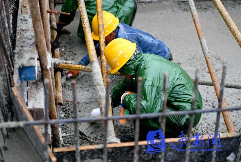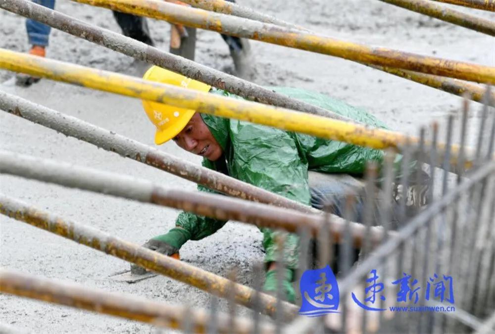 10月3日,宿遷市上海路(高鐵站連接線)改造二期工程項(xiàng)目工地工人正在雨中進(jìn)行施工作業(yè),混凝土澆筑、起重機(jī)運(yùn)轉(zhuǎn)、工程車往返,呈現(xiàn)出一派熱火朝天的勞動(dòng)場景。