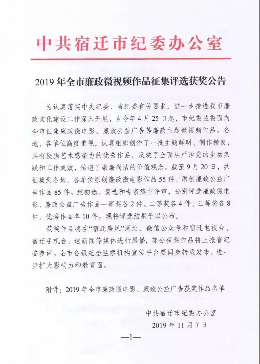 11月7日,宿遷紀(jì)委公布2019年全市廉政微視頻評(píng)選結(jié)果,集團(tuán)報(bào)送的參賽作品《路》、《責(zé)任》分別榮獲廉政公益廣告二等獎(jiǎng)、廉政微電影優(yōu)秀作品的佳績(jī)。