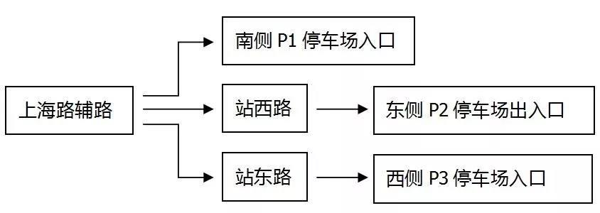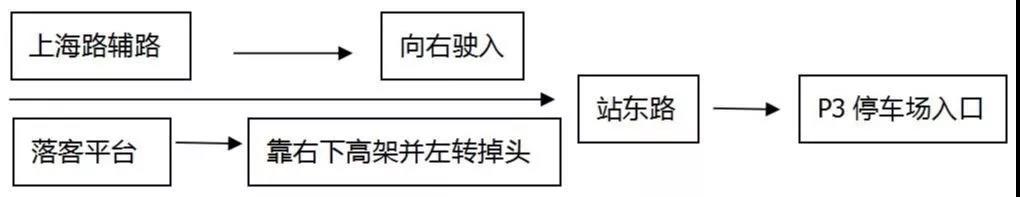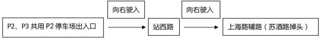 P2和P3停車庫共用一個(gè)出口,返程路線為從P2停車庫出口出,右轉(zhuǎn)進(jìn)入站西路后再右轉(zhuǎn)進(jìn)入上海路輔路,在上海路與蘇酒路交叉口掉頭,按照指示標(biāo)志進(jìn)入主線或轉(zhuǎn)入其他道路。
