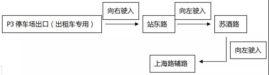 排隊(duì)等待區(qū)接到客人后,出租車進(jìn)入站東路后右拐行至與蘇酒路交叉口,左拐進(jìn)入蘇酒路后再左拐進(jìn)入上海路地面輔路,按照指示標(biāo)志轉(zhuǎn)至發(fā)展大道、人民大道、世紀(jì)大道或迎賓大道。
