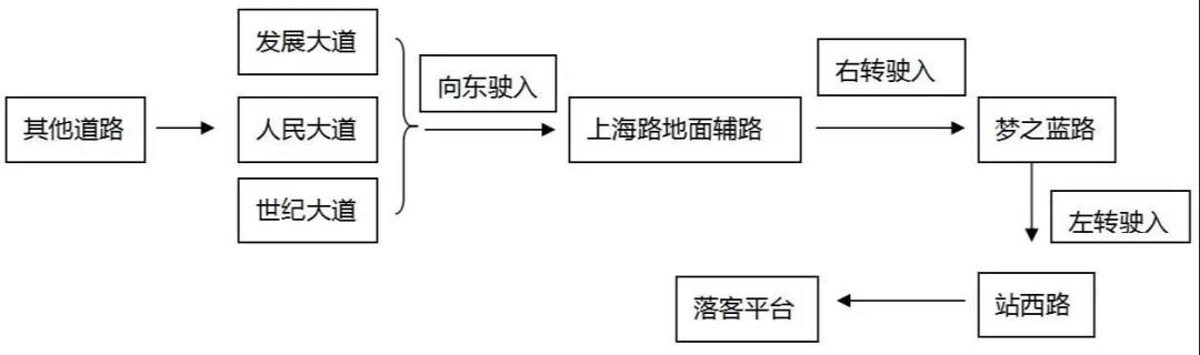 車輛可以通過外圍道路經(jīng)迎賓大道或發(fā)展大道、人民大道和世紀(jì)大道進(jìn)入上海路輔路,直行通過夢之藍(lán)路交叉口后根據(jù)指示標(biāo)志的引導(dǎo),分別進(jìn)入P1、P2、P3停車庫。