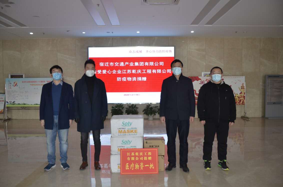 2月19日,愛心企業(yè)江蘇乾慶工程有限公司將一批承載著對(duì)疫情防控一線人員滿滿關(guān)懷的防疫物資贈(zèng)送給宿遷交通集團(tuán),支援集團(tuán)疫情防控工作,傳遞抗“疫”正能量。