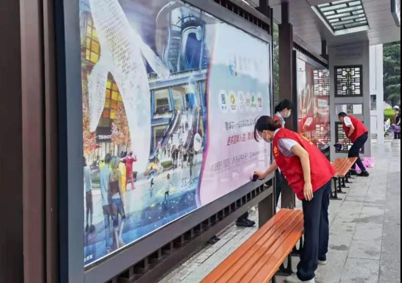 活動(dòng)中,黨員志愿者們統(tǒng)一穿戴志愿服務(wù)馬甲,拿著抹布、水桶、掃帚等工具對(duì)洪澤湖路段公交候車亭、電子站牌、公益畫(huà)面、凳子及周邊環(huán)境進(jìn)行清理,更換新的公益畫(huà)面幅。經(jīng)過(guò)半天的清理打掃,公交候車亭的活動(dòng)區(qū)域煥然一新。