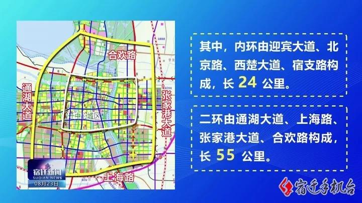 根據(jù)《規(guī)劃修編》,宿遷將形成“二環(huán)十射”的快速路網(wǎng),總里程166公里。其中,內(nèi)環(huán)由迎賓大道、北京路、西楚大道、宿支路構(gòu)成,長(zhǎng)24公里;二環(huán)由通湖大道、上海路、張家港大道、合歡路構(gòu)成,長(zhǎng)55公里;十射為迎賓大道北延、新?lián)P高速連接線(xiàn)、西楚大道北延、富春江路、宿支路東延、宿支路西延、北京路東延、徐淮路、黃河南路、發(fā)展大道,總長(zhǎng)87公里。
