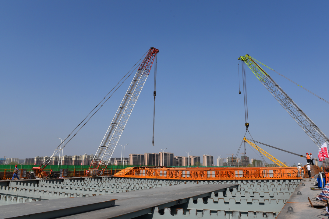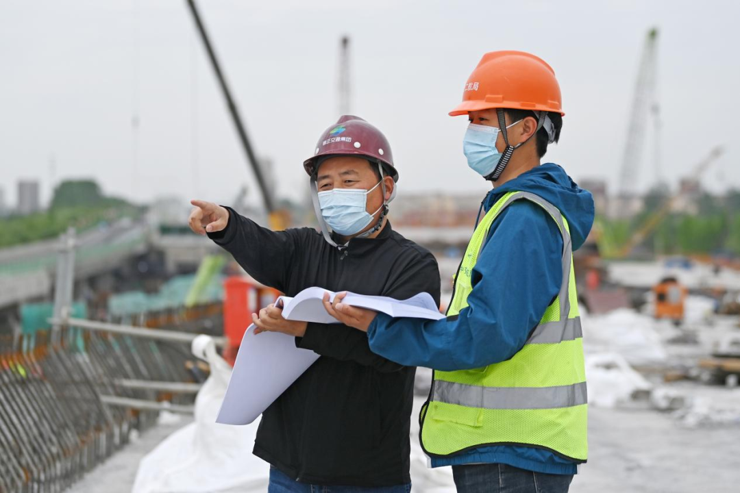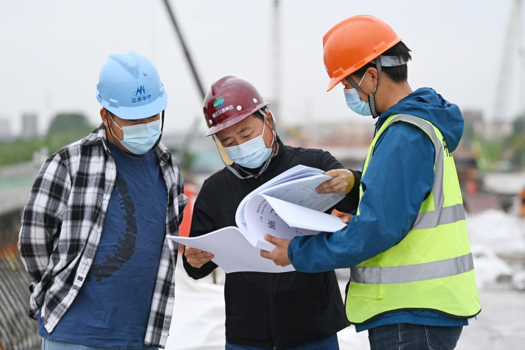 機器轟鳴、鋼架林立、塔吊聳立,5月1日,在北京路快速化改造工程跨京杭運河特大橋施工現(xiàn)場,建設(shè)工人戴著口罩不停穿梭于道路開挖、管道鋪設(shè)、橋梁架構(gòu)等各個作業(yè)面,北京路快速化改造工程項目管理組組長朱寶廣與技術(shù)員認真核對圖紙,反復商討下一階段施工方案。
