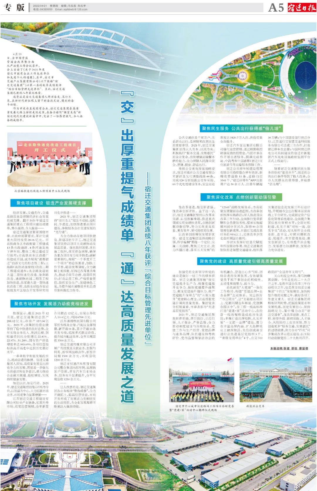 4月21日,《宿遷日報》以《“交”出厚重提氣成績單 “通”達(dá)高質(zhì)量發(fā)展之道——宿遷交通集團(tuán)連續(xù)八年獲評“綜合目標(biāo)管理先進(jìn)單位”》為題,專版報道了集團(tuán)2021年聚焦項(xiàng)目建設(shè)、市場開發(fā)、民生服務(wù)、深化改革、黨的建設(shè)等方面奮力取得的優(yōu)異成績。全文報道如下: