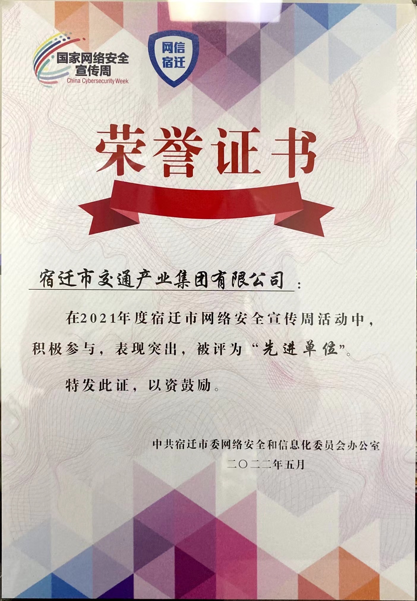 宿遷交通集團榮獲2021年度宿遷市網絡安全宣傳周活動先進單位