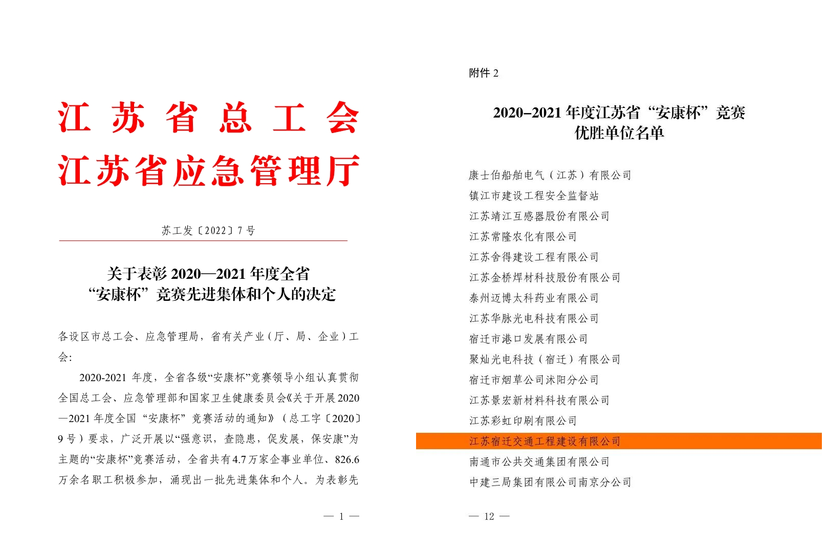 日前,省總工會和省應(yīng)急管理廳發(fā)文通報了2020-2021年度江蘇省“安康杯”競賽評選情況,宿遷交建榮獲省“安康杯”競賽“優(yōu)勝單位”稱號。