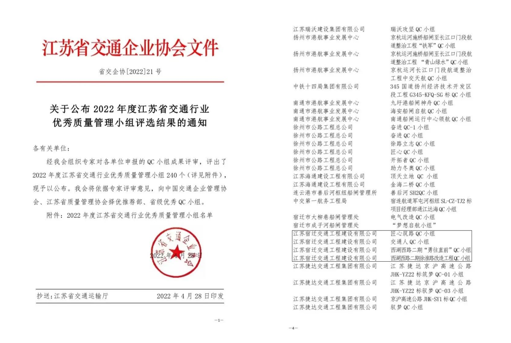 近日,江蘇省交通企業(yè)協(xié)會公布2022年度江蘇省交通行業(yè)優(yōu)秀質(zhì)量管理小組評選結(jié)果,宿遷交建徐淮路改造工程項(xiàng)目QC小組及“勇往直前”QC小組、匠心筑路QC小組、交通人QC小組榮獲“2022年江蘇省交通行業(yè)優(yōu)秀質(zhì)量管理小組”稱號。
