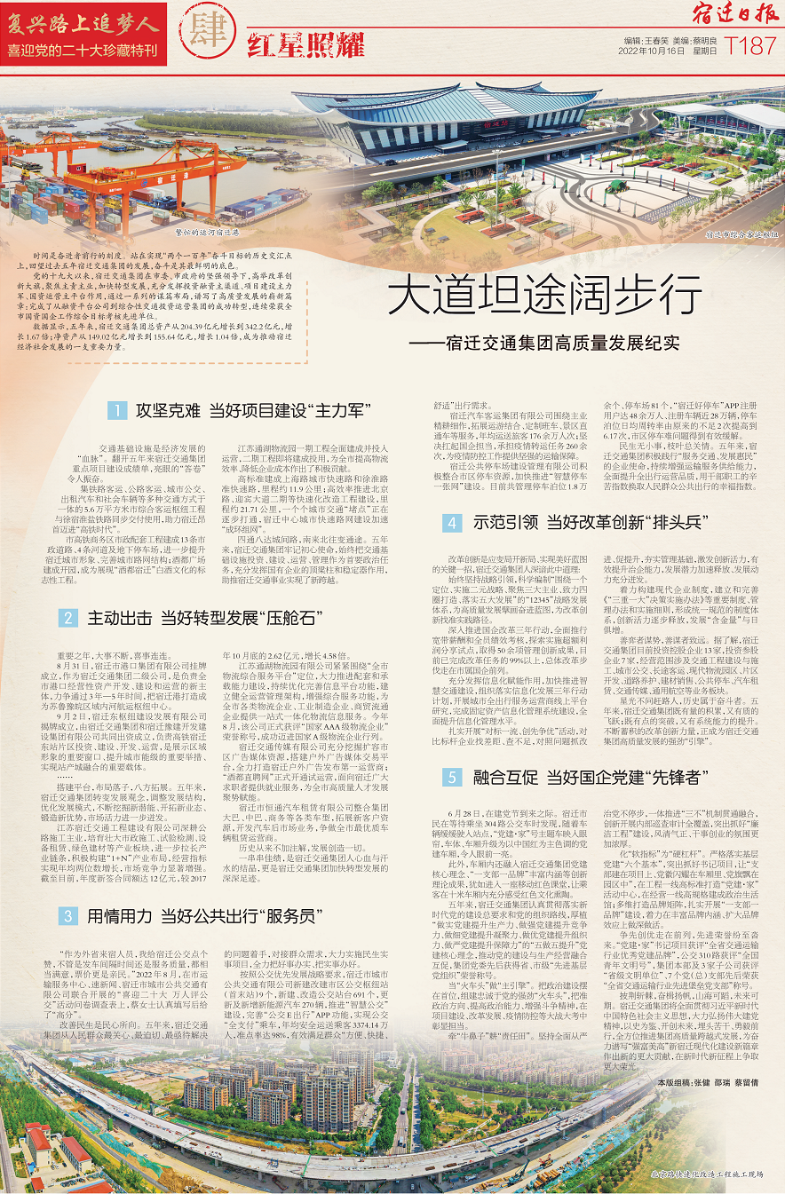 10月16日,《宿遷日?qǐng)?bào)》推出喜迎黨的二十大珍藏特刊,以《大道坦途闊步行——宿遷交通集團(tuán)高質(zhì)量發(fā)展紀(jì)實(shí)》為題,專版報(bào)道了過去五年,集團(tuán)在市委、市政府的堅(jiān)強(qiáng)領(lǐng)導(dǎo)下,充分發(fā)揮投資融資主渠道、項(xiàng)目建設(shè)主力軍、國(guó)資運(yùn)營(yíng)主平臺(tái)作用,通過一系列的謀篇布局,譜寫了高質(zhì)量發(fā)展的嶄新篇章。