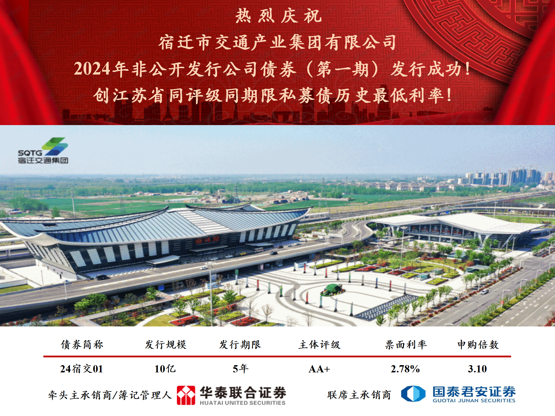 4月24日,宿遷交通集團成功發(fā)行2024年非公開發(fā)行公司債券(第一期),發(fā)行規(guī)模10億元,期限5年,由華泰聯(lián)合證券、國泰君安證券聯(lián)合承銷,票面利率2.78%,創(chuàng)江蘇省同評級同期限私募債歷史最低利率。