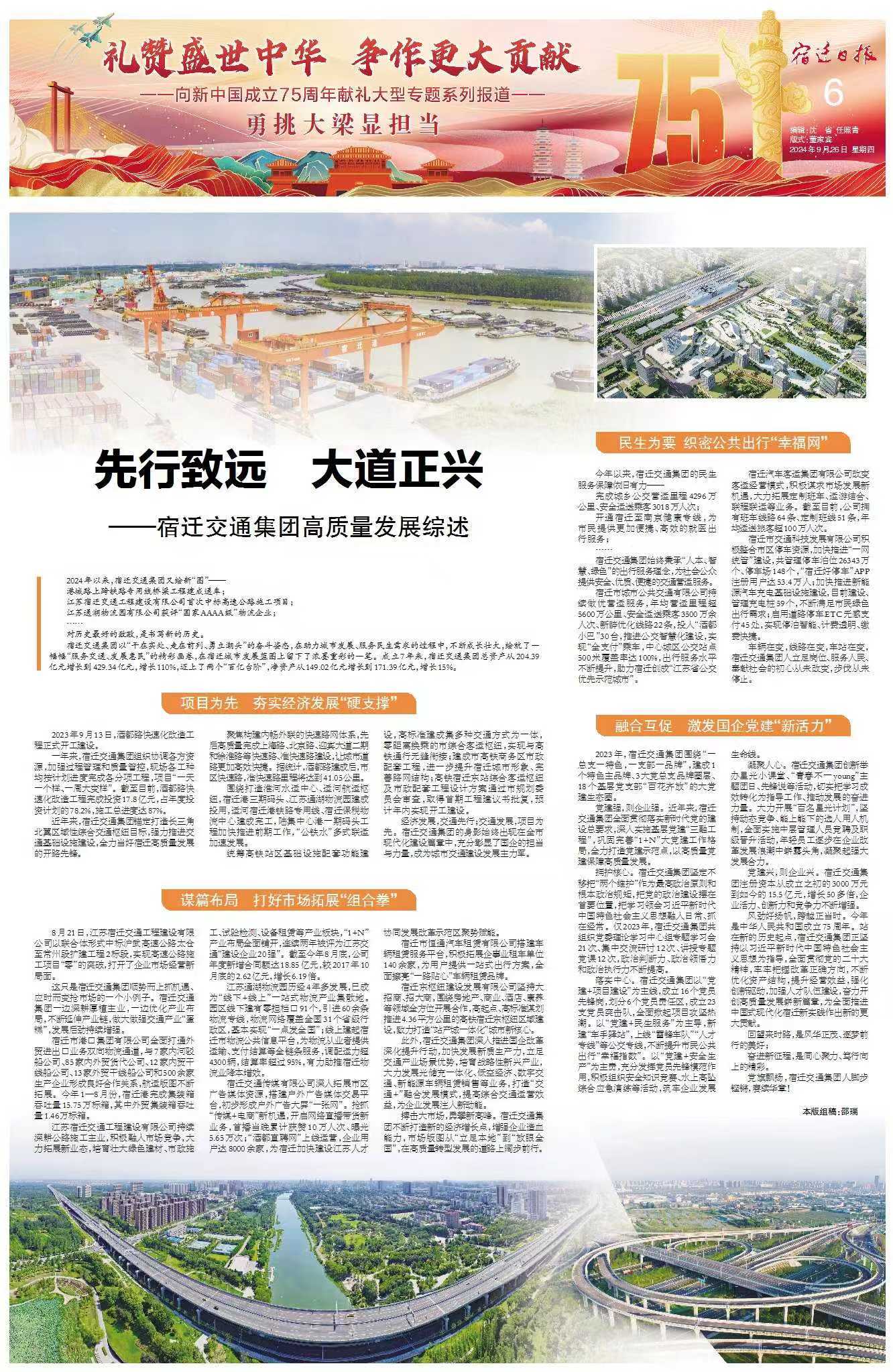 風勁好揚帆,跨越正當時。今年是中華人民共和國成立75周年。站在新的歷史起點,宿遷交通集團正堅持以習近平新時代中國特色社會主義思想為指導,全面貫徹黨的二十大精神,牢牢把握改革正確方向,不斷優(yōu)化資產(chǎn)結(jié)構(gòu),提升經(jīng)營效益,強化創(chuàng)新驅(qū)動,加強人才隊伍建設(shè),奮力開創(chuàng)高質(zhì)量發(fā)展嶄新篇章,為全面推進中國式現(xiàn)代化宿遷新實踐作出新的更大貢獻。