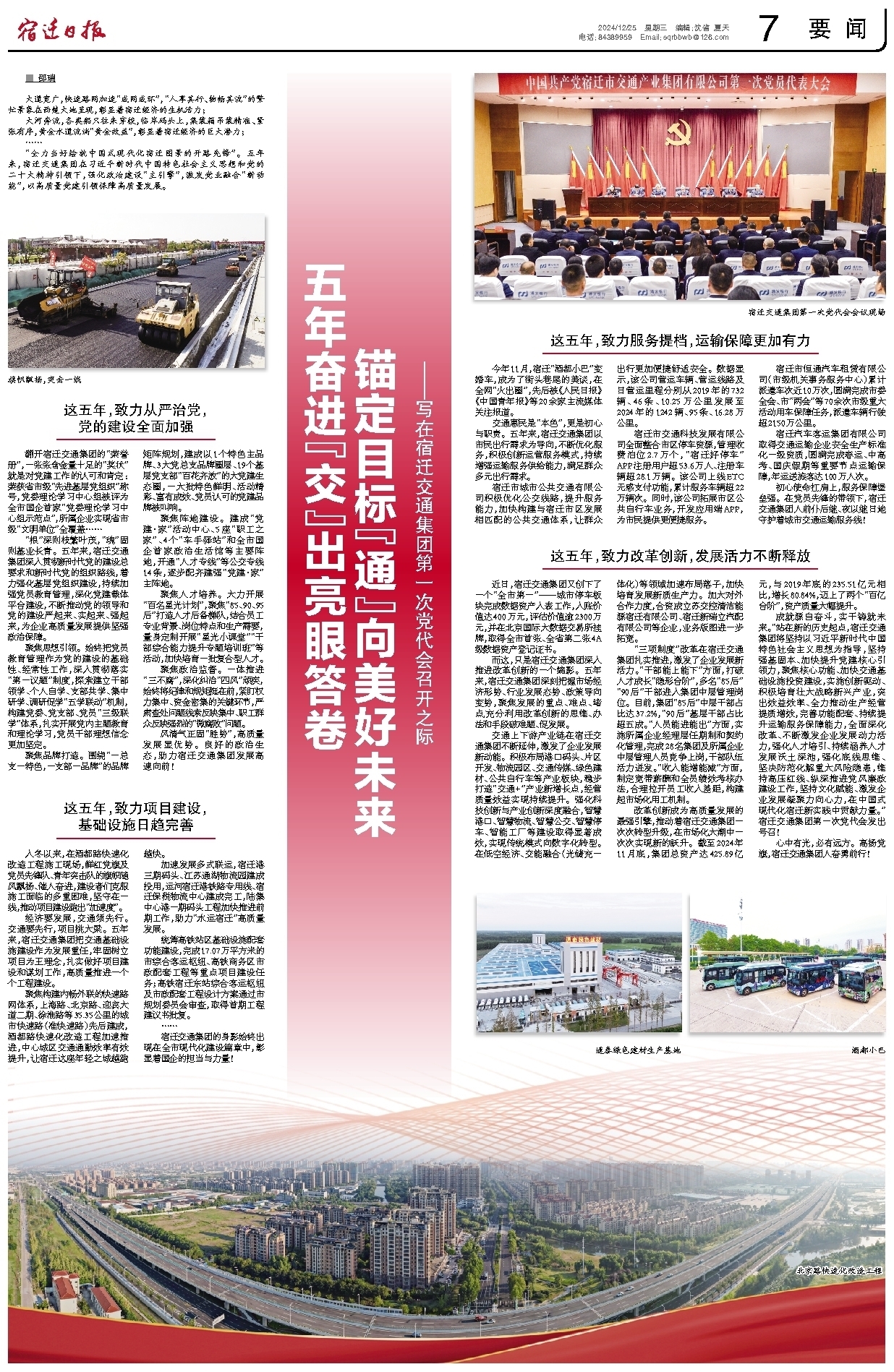 成就源自奮斗,實干鑄就未來。“站在新的歷史起點,宿遷交通集團(tuán)將堅持以習(xí)近平新時代中國特色社會主義思想為指導(dǎo),堅持強(qiáng)基固本、加快提升黨建核心引領(lǐng)力,聚焦核心功能、加快交通基礎(chǔ)設(shè)施投資建設(shè),實施創(chuàng)新驅(qū)動、積極培育壯大戰(zhàn)略新興產(chǎn)業(yè),突出效益效率、全力推動生產(chǎn)經(jīng)營提質(zhì)增效,完善功能配套、持續(xù)提升運(yùn)輸服務(wù)保障能力,全面深化改革、不斷激發(fā)企業(yè)發(fā)展動力活力,強(qiáng)化人才培引、持續(xù)涵養(yǎng)人才發(fā)展沃土深池,強(qiáng)化底線思維、堅決防范化解重大風(fēng)險隱患,維持高壓紅線、縱深推進(jìn)黨風(fēng)廉政建設(shè)工作,堅持文化賦能、激發(fā)企業(yè)發(fā)展凝聚力向心力,在中國式現(xiàn)代化宿遷新實踐中貢獻(xiàn)力量。”宿遷交通集團(tuán)第一次黨代會發(fā)出號召!