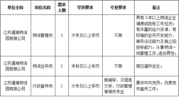 江蘇通湖物流園有限公司是一家從事物流經營與管理的國有企業(yè),為滿足業(yè)務發(fā)展需要,現面向社會公開招聘一批勞務派遣制人員?,F將有關事項公布如下: