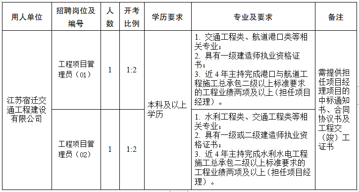 5. 具備招聘崗位要求的其它資格和條件。具體詳見《宿遷市交通產(chǎn)業(yè)集團(tuán)有限公司工程技術(shù)人員招聘崗位表》。