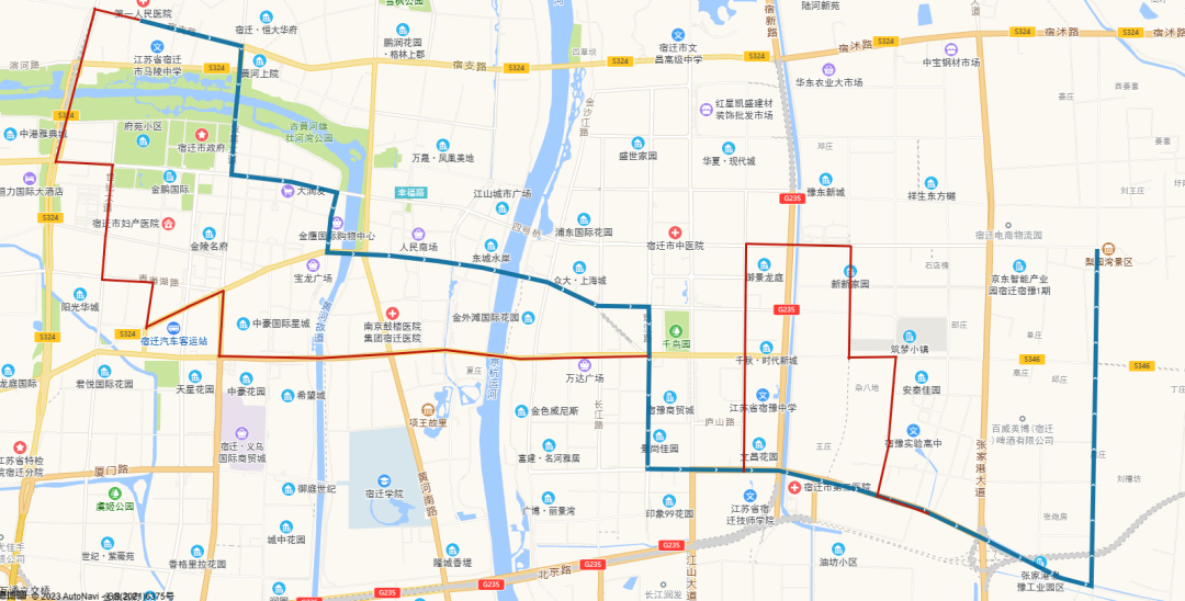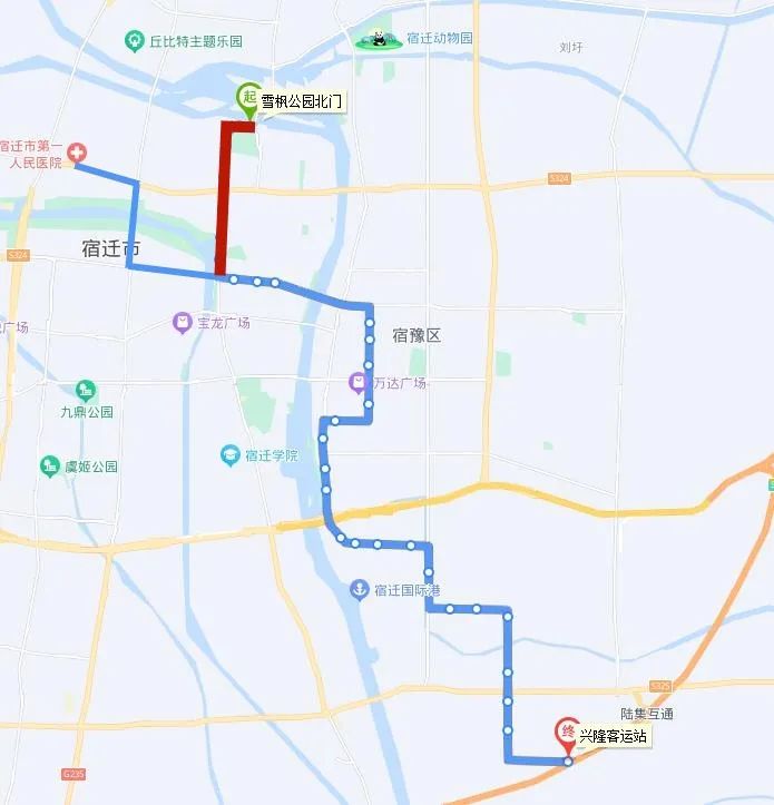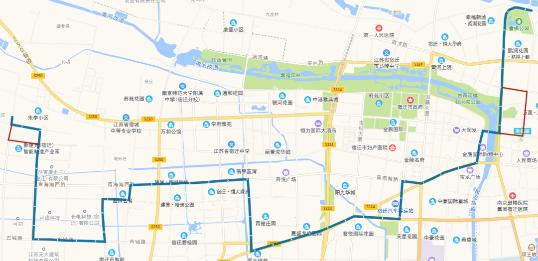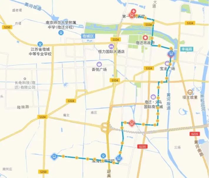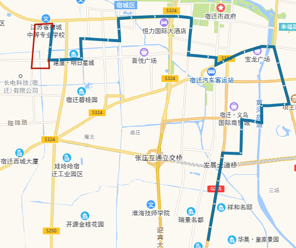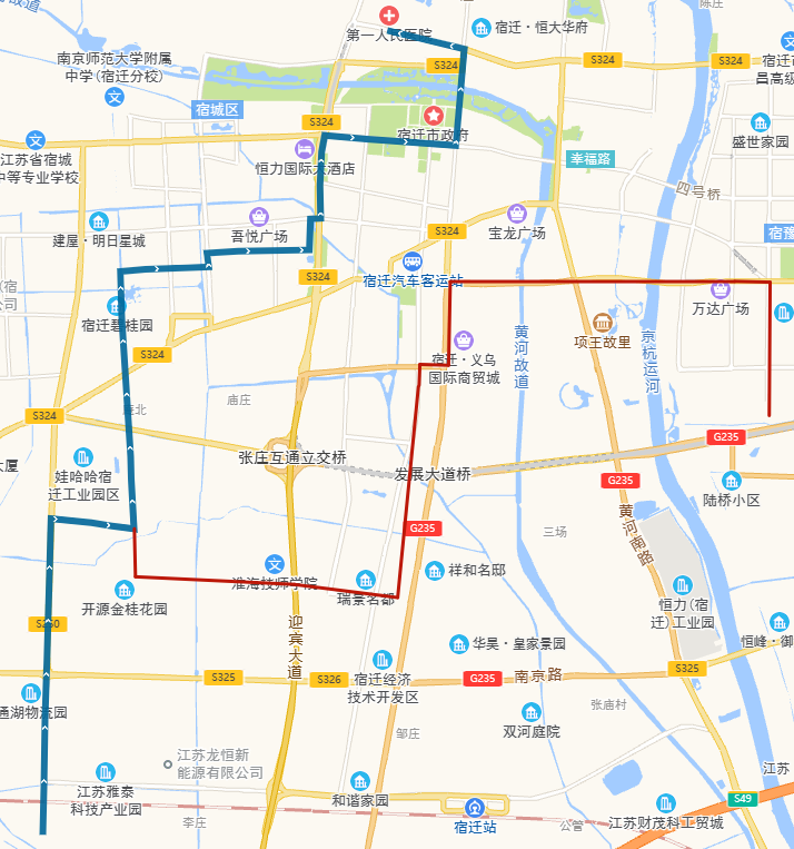 (四)318路。將現(xiàn)市第一人民醫(yī)院公交首末站—頤和路—濱河路—迎賓大道—洪澤湖路—世紀(jì)大道—青海湖路—平安大道—西湖路—發(fā)展大道—項王路—項王東路—珠江路—學(xué)海路—黃浦江路—洪澤湖東路—漢江路—項王東路—張家港大道—雪峰山路—楊舍路—梨園灣路段,優(yōu)化為市第一人民醫(yī)院公交首末站—宿支路—發(fā)展大道—洪澤湖路—青年路—西湖路—西湖東路—珠江路—黃山路—雪峰山路—楊舍路—梨園灣。