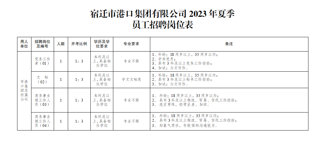 本次面向社會(huì)公開招聘工作人員共4人,具體崗位詳見《宿遷市港口集團(tuán)有限公司2023年夏季員工招聘崗位表》(見附件,以下簡(jiǎn)稱《崗位表》)。