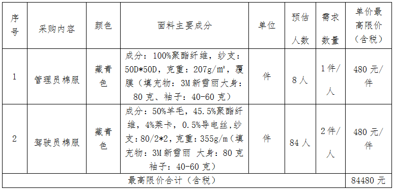 (一)主要內(nèi)容:本項目為宿遷市城市公共交通有限公司職工冬季服裝采購項目。采購內(nèi)容包括: