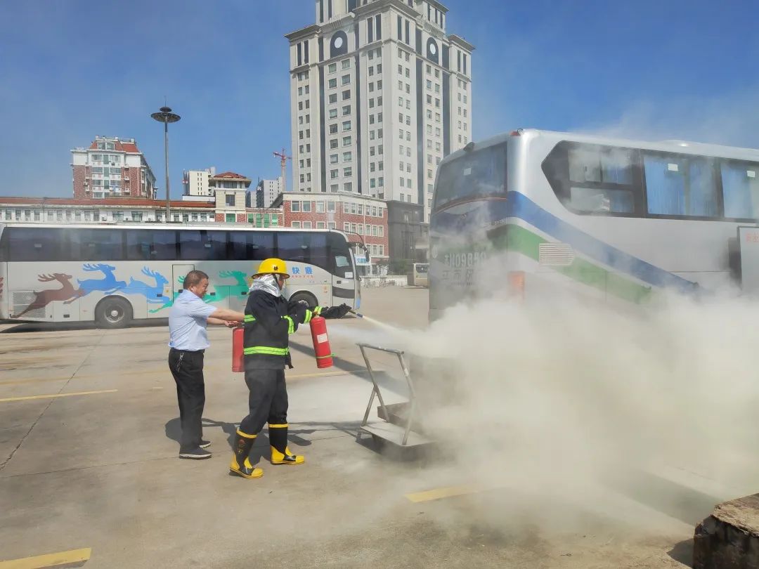 演練過(guò)程中,以客車突發(fā)“火災(zāi)”為背景案例,隨著濃煙升起,駕駛員迅速停車打開車門,快速有序疏散車上旅客至安全地帶,然后關(guān)掉電源取下隨車滅火器,對(duì)準(zhǔn)著火部位正面根部噴射,撲滅火災(zāi),并迅速立即撥打119消防部門報(bào)警,真正做到即停車、人撤離、速報(bào)警的演練目標(biāo)要求,達(dá)到了預(yù)期效果。